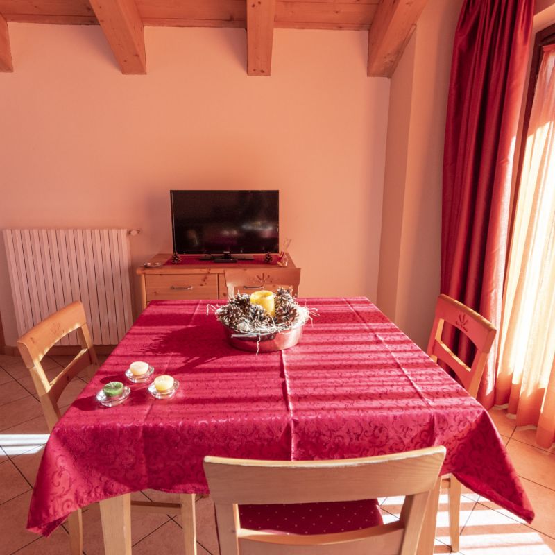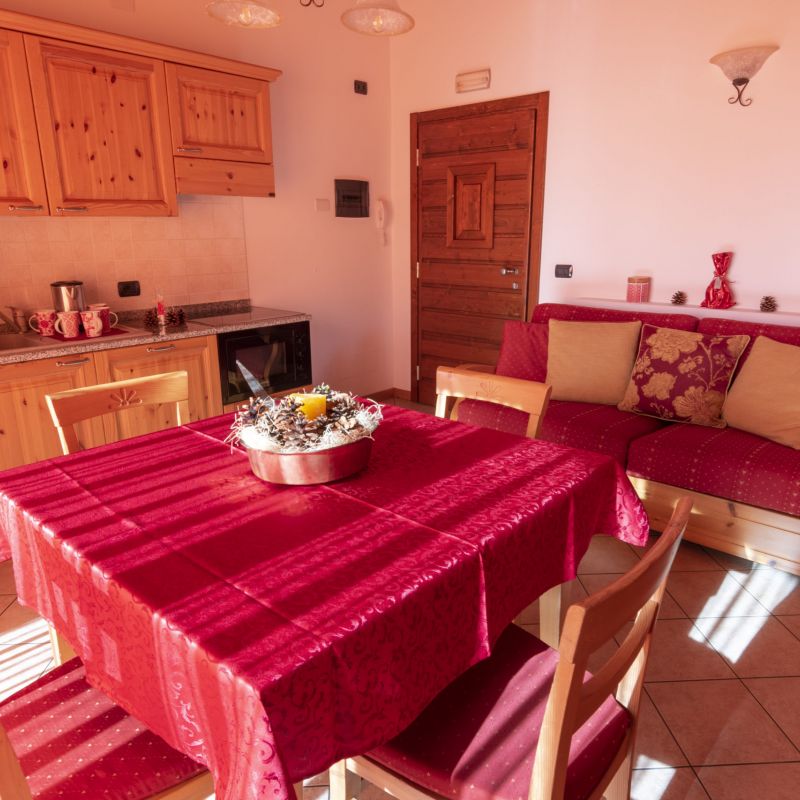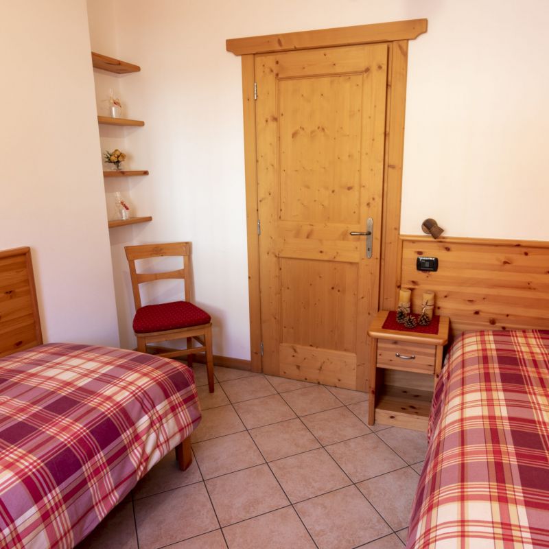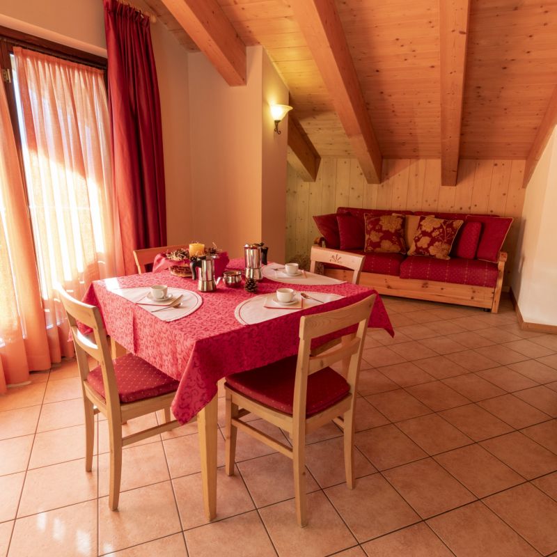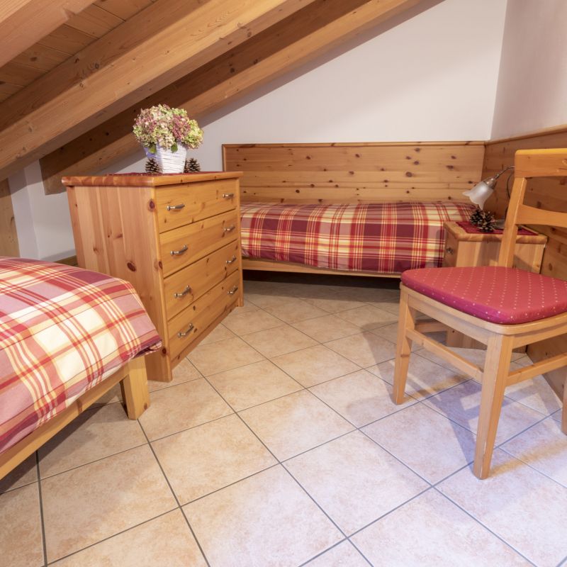 The Camoscio apartment is located on the first floor and mirrors the nearby Stambecco apartment. It consists of a living room / kitchen with sofa bed, two bedrooms (one double and the other with two single beds), a bathroom with shower and three balconies that delimit the apartment on two sides. The south balconies enjoy sunlight from morning to sunset, especially in summer, and offer an excellent opportunity to admire the surrounding mountains and enjoy the pure air in peace and privacy.