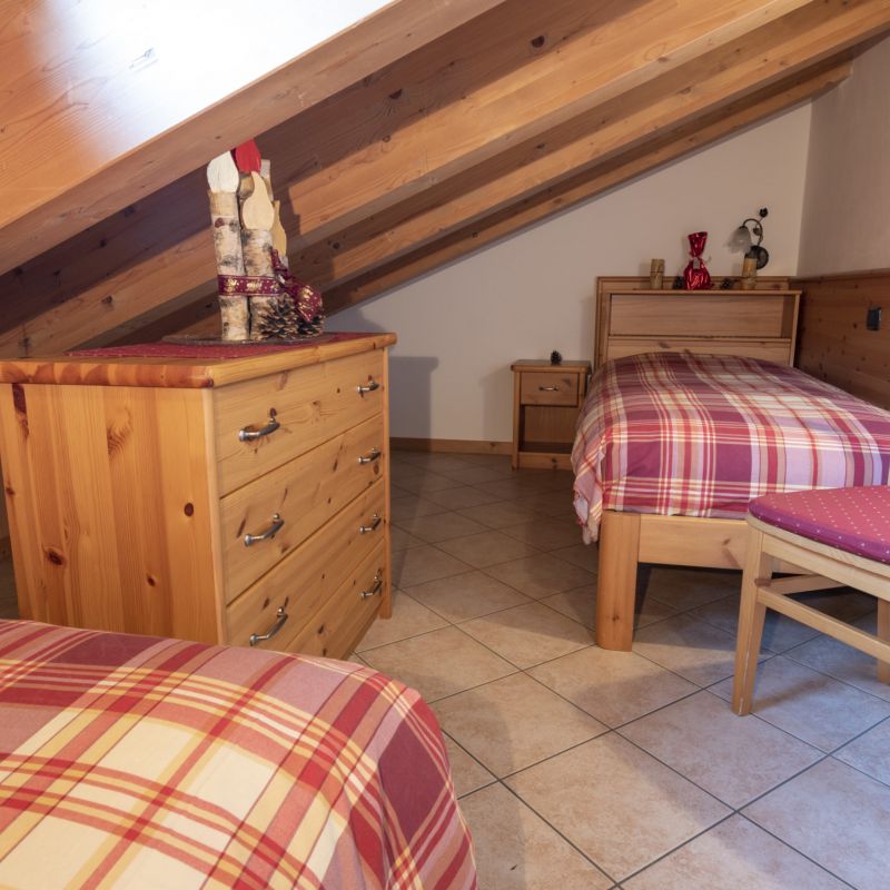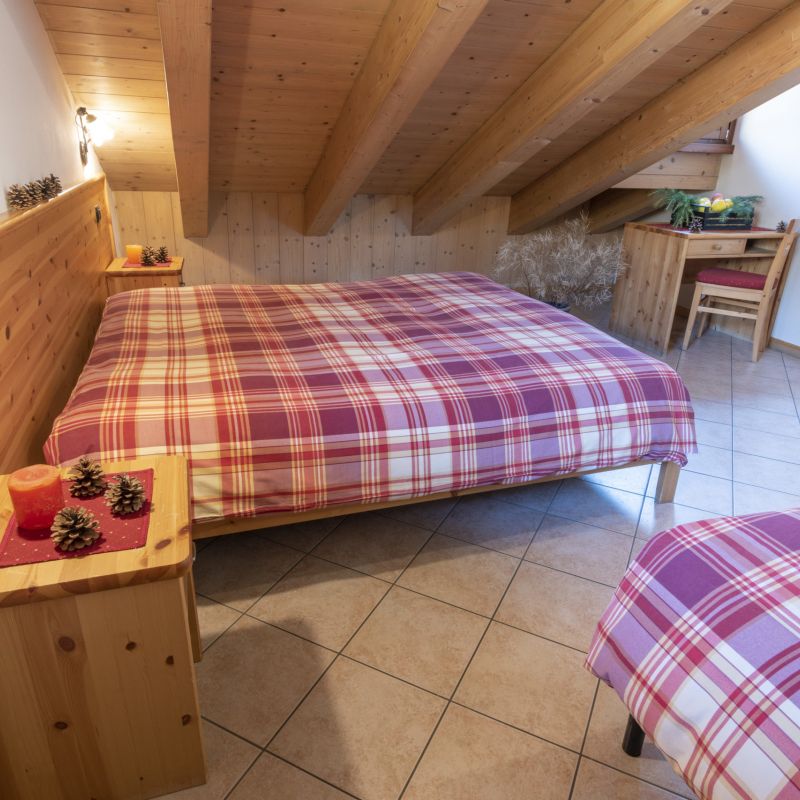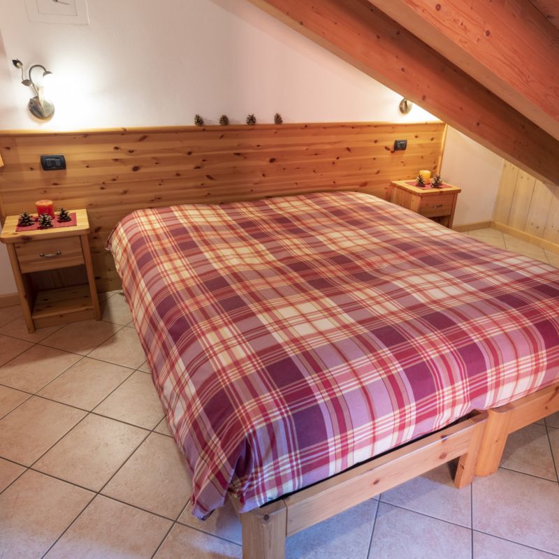 The Ermellino three-room apartment is located on the attic floor next to the Marmotta apartment. It consists of a living room / kitchen with sofa bed, a very intimate bedroom, another bedroom with two single beds and a bathroom with shower. The large balcony offers a magnificent 360 ° view of the surrounding mountains and the valley. Ideal for sunbathing in complete tranquility and absolute privacy.